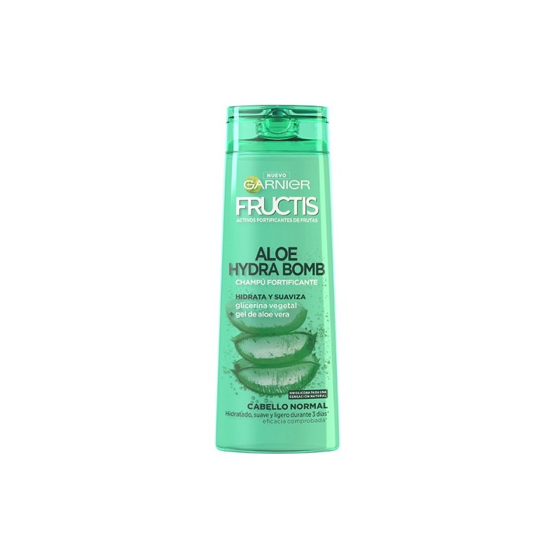 Fructis Aloe Hydrabomb es un champú fortificante enriquecido con gel de aloe vera y glicerina vegetal de origen natural para hidratar sin apelmazar.