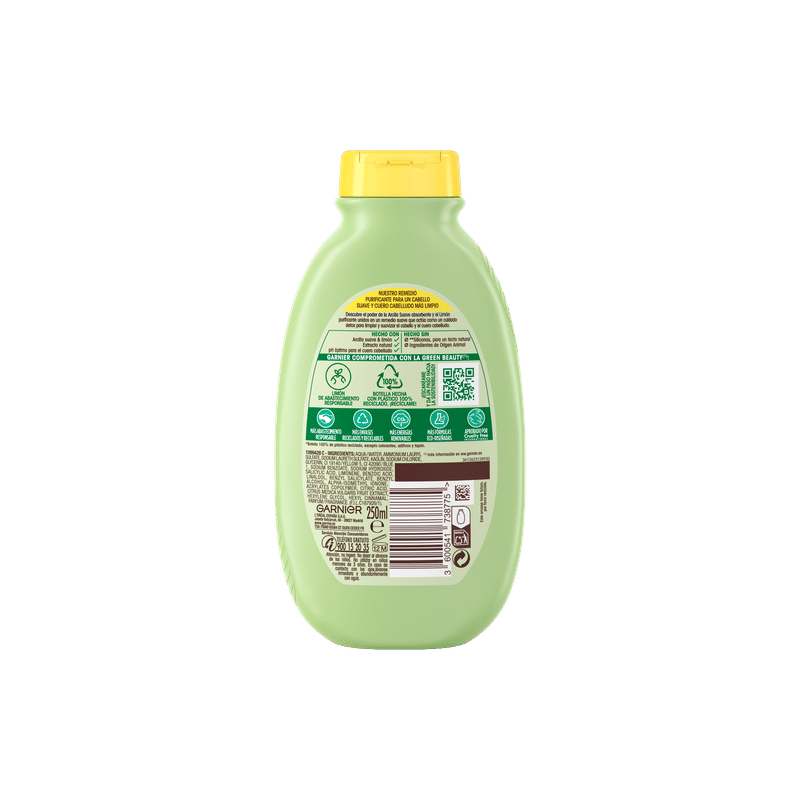 Champú Arcilla suave y Limón para pelo graso limpia y purifica en profundidad para tener un pelo limpio y ligero por más tiempo.